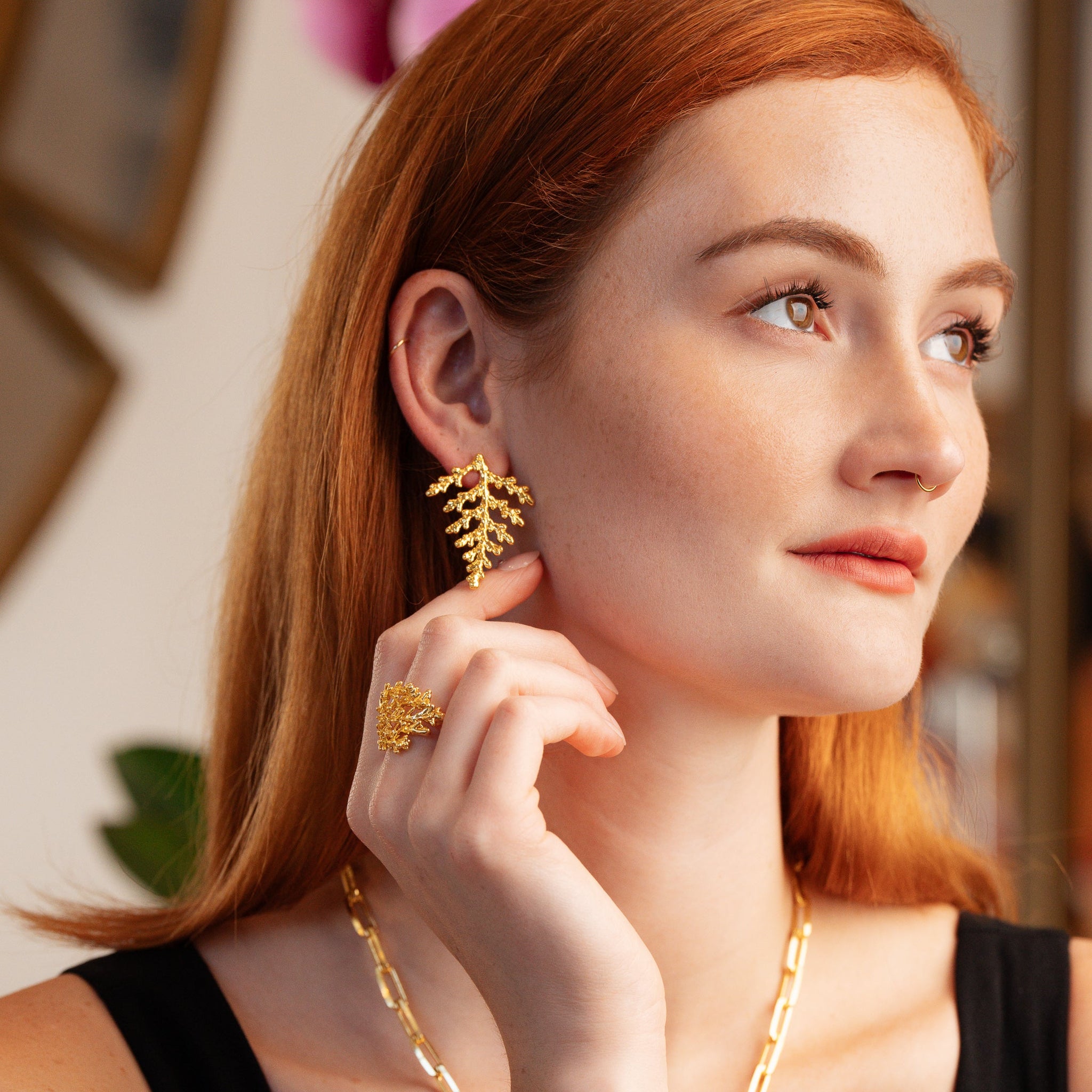 Cypress trees are evergreens and are commonly depicted as a variation of the tree of life motif, which represents everlasting life. Cypresses have a distinct and intricate texture. When these leaves are dipped in 18-karat gold (or Silver and Rhodium) the result is rich and bold. This pair of earrings is a statement piece complements well any style - whether you wear your hair up or down. The shine of the precious metals accentuates its beauty, charm, and elegance.