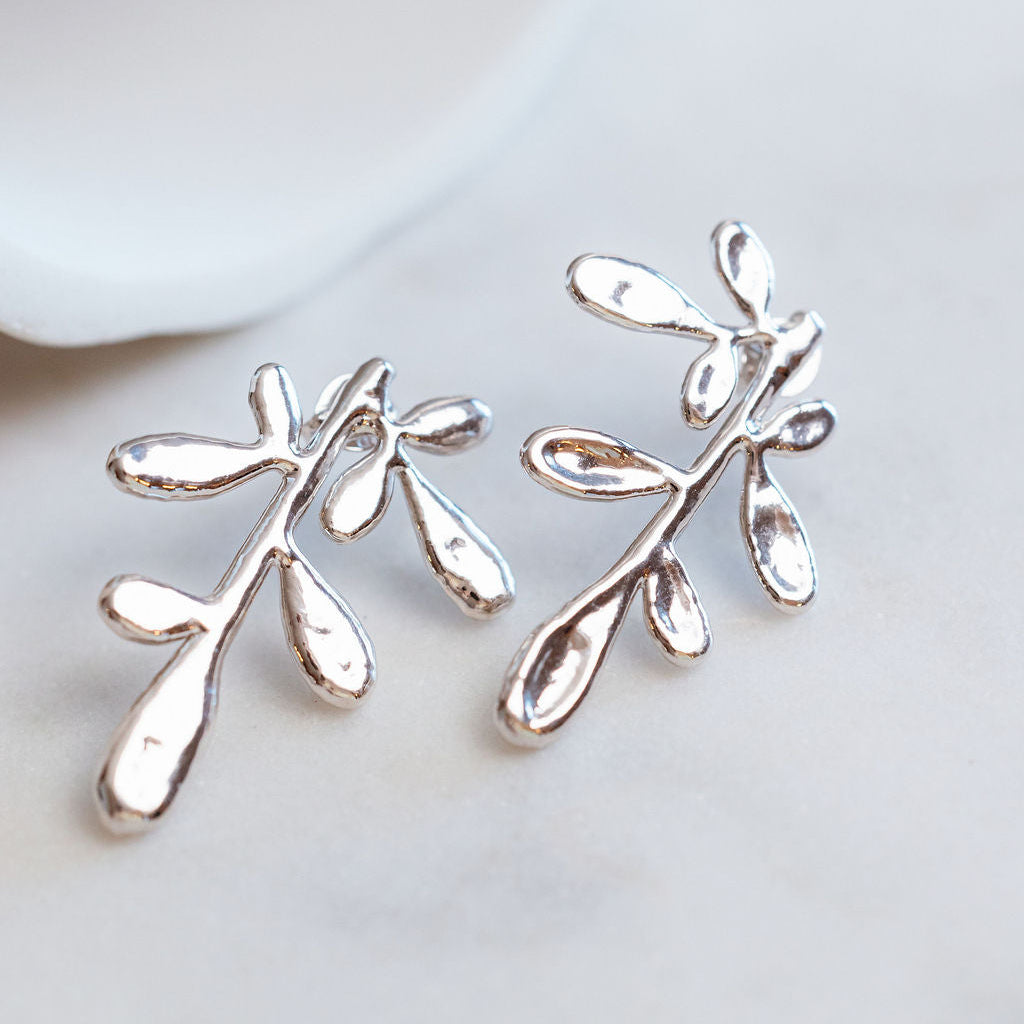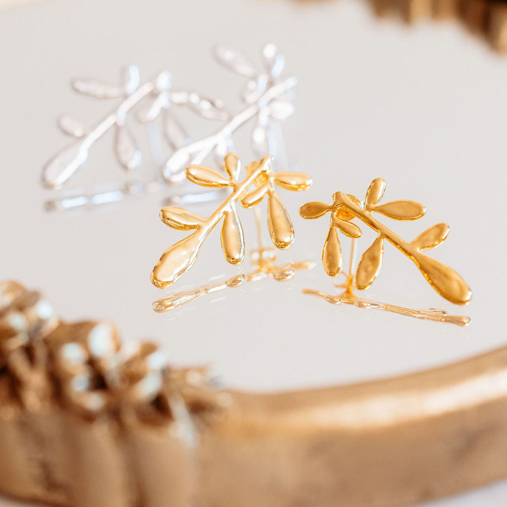 Grace Herb (Arruda in Portuguese) is a sought after and beloved leaf in Brazil due to the popular belief that it wards off negative energy and the evil eye. A piece of jewelry made with this mystical plant will always attract compliments as well for its simple shape, yet modern and sophisticated. We also offer the Grace Herb in studs, necklace, and bracelet.
