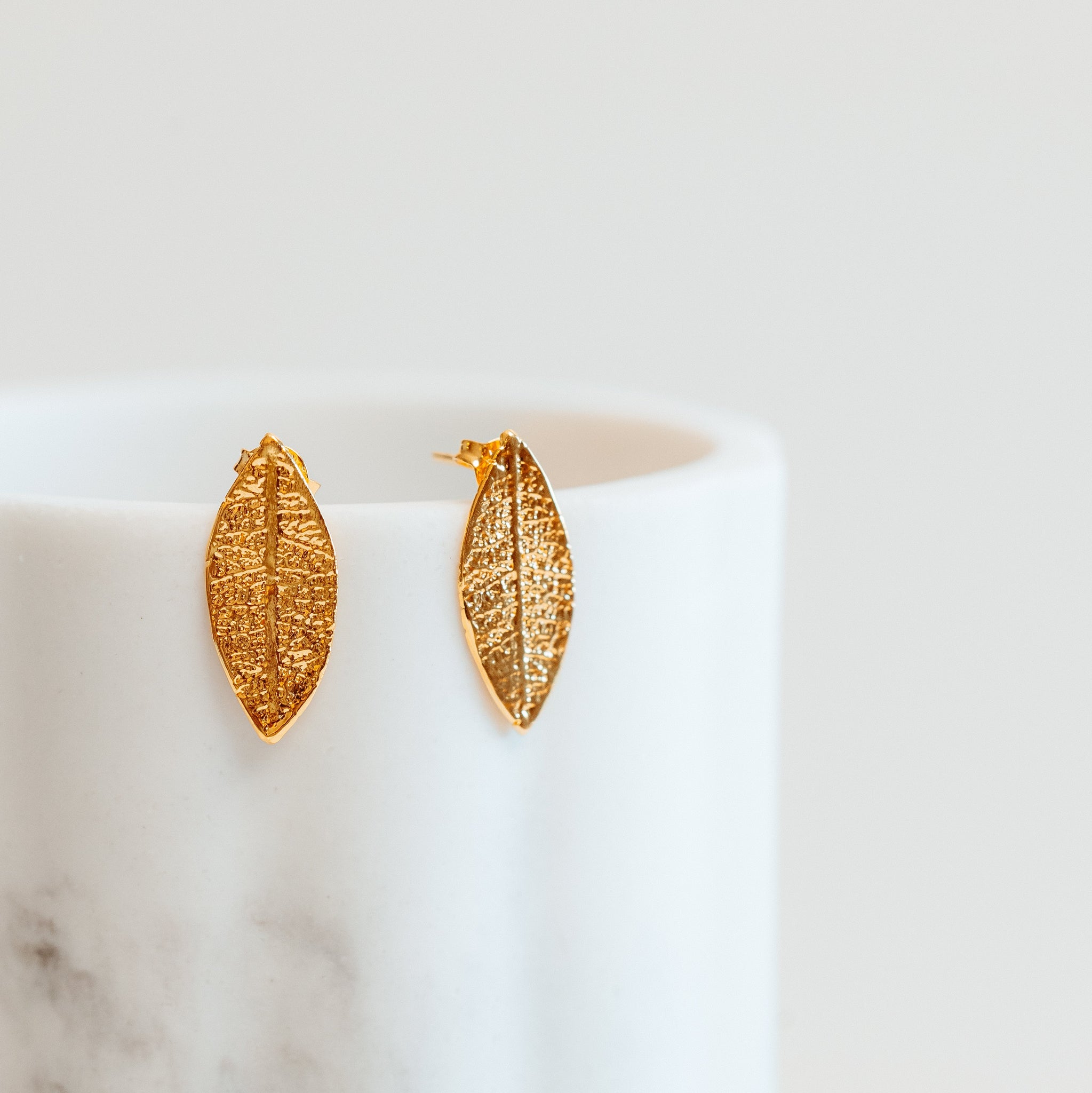 The bark of the legendary Quina tree, native to South America, contains the widely used medicinal quinine. These trees also provide the leaves used in these curvy and absolutely stunning earrings - available in 18K-gold (or silver plus rhodium). These earrings are cut to shape and with each layer of the gold (or silver) - from health to fashion.